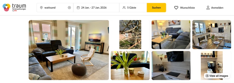 Die BuchungGemeinsam mit unseren Partnern bieten wir Ihnen übersichtliche BuchungsmöglichkeitenDas Haus Wattsand ist auf verschiedenen Buchungsplattformen gelistet. Die hinterlegten Buchungszeiträume und Konditionen werden von uns stets für Sie aktuell gehalten, damit Sie schnell und komfortabel zu Ihrer verdienten Erholung kommen.Hier eine Auswahl der Plattformen auf denen Sie das Haus Wattsand buchen können: Traum-Ferienwohnungen Nur noch wenige Clicks zu Ihrem Urlaub! |